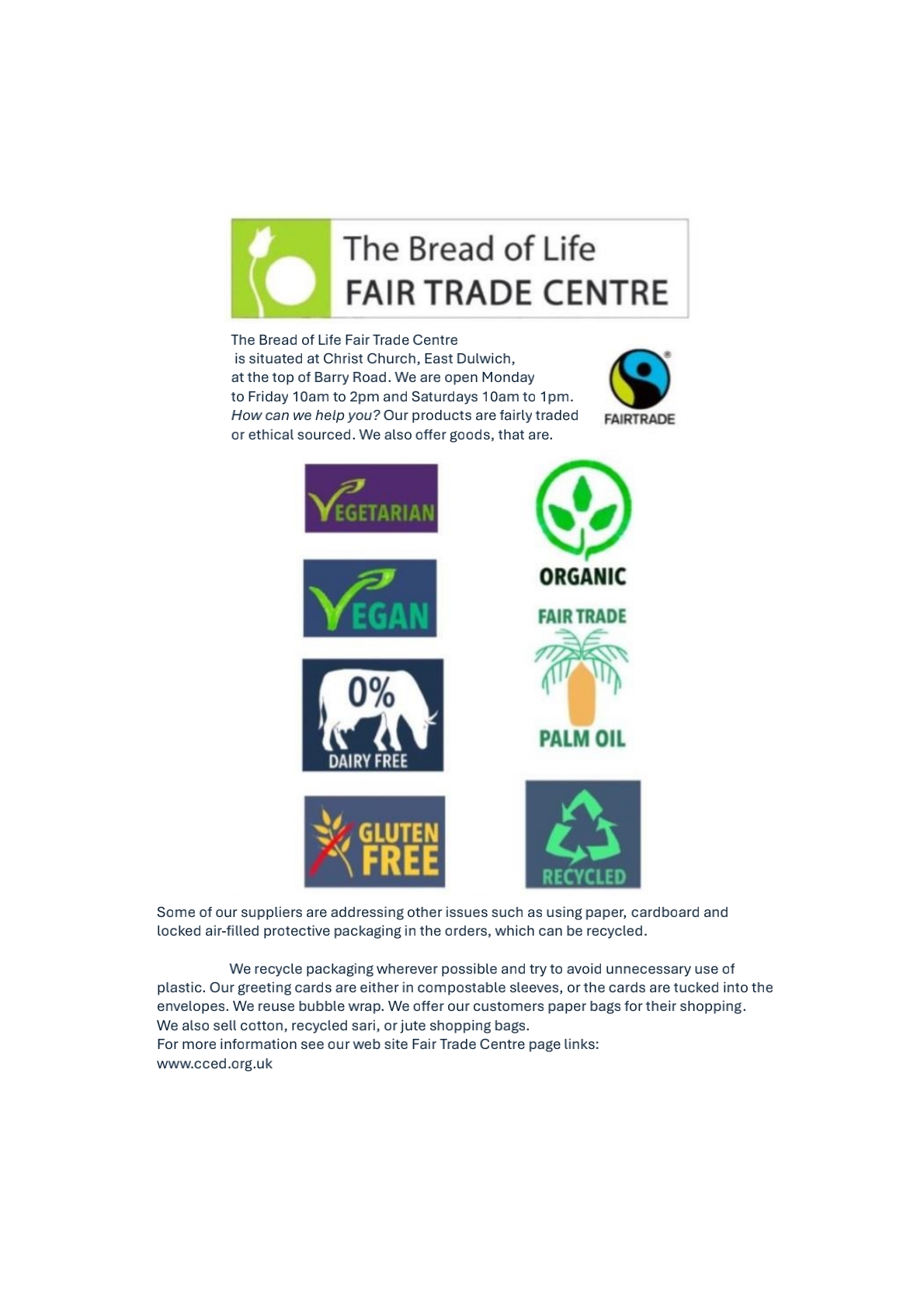 We sell Fair Trade and Eco-Friendly food and gifts to promote the vision of a fair trading system for the wider world community, especially through the Bread of Life Fair Trade Centre.